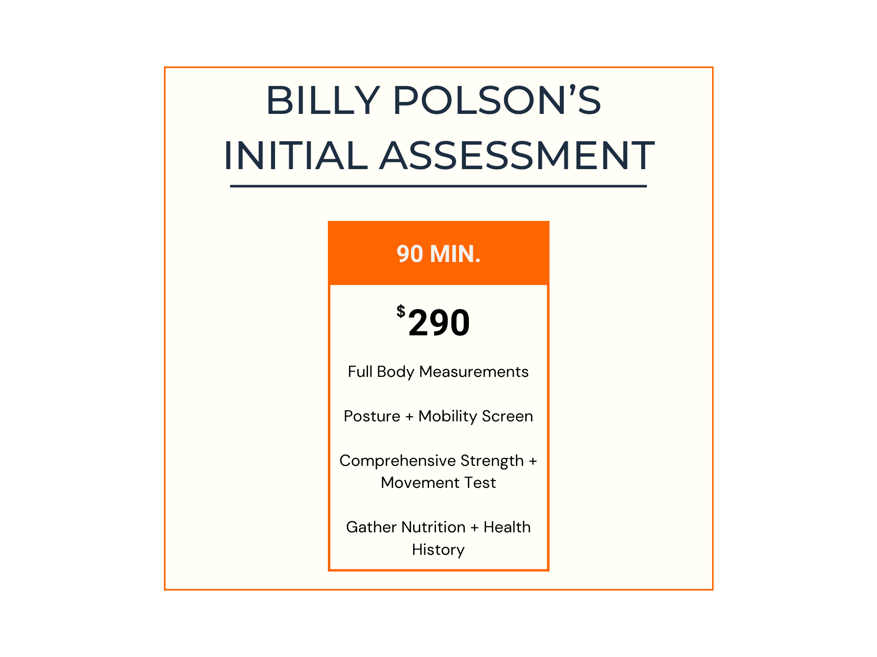 The kickstart for each of Billy Polson’s clients is his 90-minute comprehensive fitness assessment, in order to learn all that he can about your health history, as well as your current physical condition and goals.