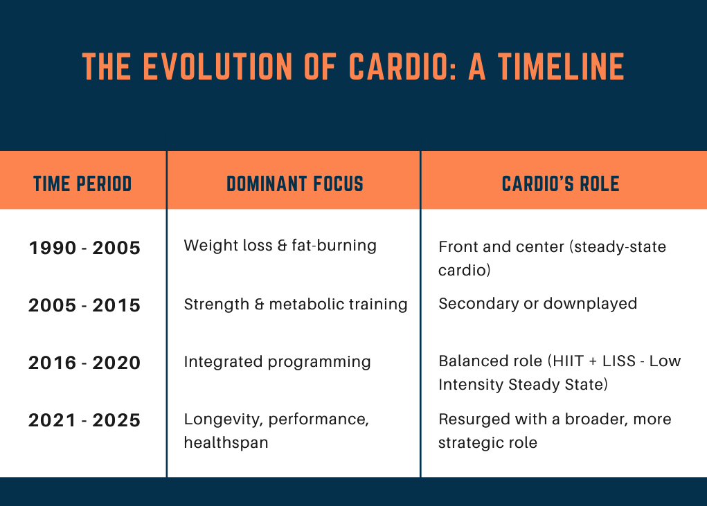 Cardiovascular training has gone through quite the identity crisis over the past few decades. When I first began personal training in 1998, it was the undisputed champion of fat loss and general health programming. The Polar heart rate monitor was our go-to cardiovascular tracking tool and we used it to monitor clients staying in their ‘fat burning zone’ during workouts to get the most bang for the buck out of their time in the gym and their results. Then in the early 2000s came the strength revolution—where cardio was pushed to the back burner in favor of heavy lifting, metabolic resistance circuits, and HIIT (High Intensity Interval Training). But in 2025, cardio programming is seeing a clear resurgence. Thanks to advancements in longevity research, wearable tech, and a renewed appreciation for heart and brain health, cardio is once again front and center. However, it's not the same old “jog on the treadmill” cardio. It’s smarter, more individualized, and precisely programmed to meet all levels of goals, including weight loss, reducing visceral fat, longevity and improved healthspan, improving cholesterol, hormonal and metabolic health.